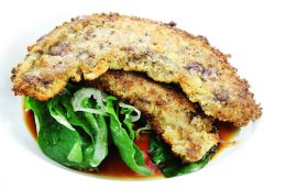 Parmesan Crumbed Lambs’ Liver with Gorgonzola dressed Baby Spinach